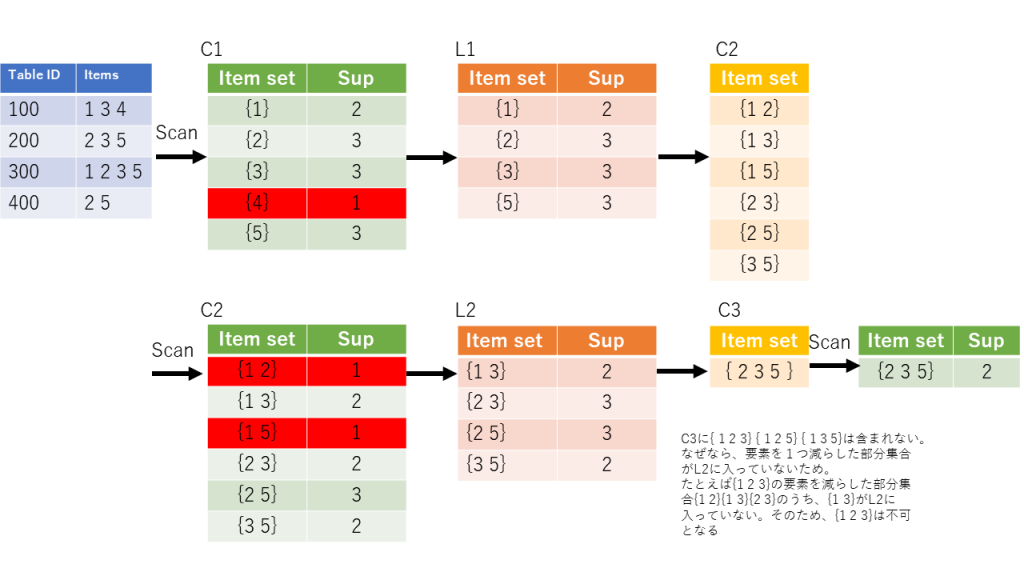 集合から、要素を取り出し、その数をカウントしてC1を作成します。しきい値(この場合は1とした)より低いものを無視して、L1を作ります。L1の要素のすべての組み合わせからC2を作ります。ここで、C2のセットで1つ減らした要素( {1 2}であれば{1}と{2}が) L1に入っていない場合、C2の要素としてカウントは出来ません。C2作成に当たりその例はありませんでした。ただC3でその事例が発生します。